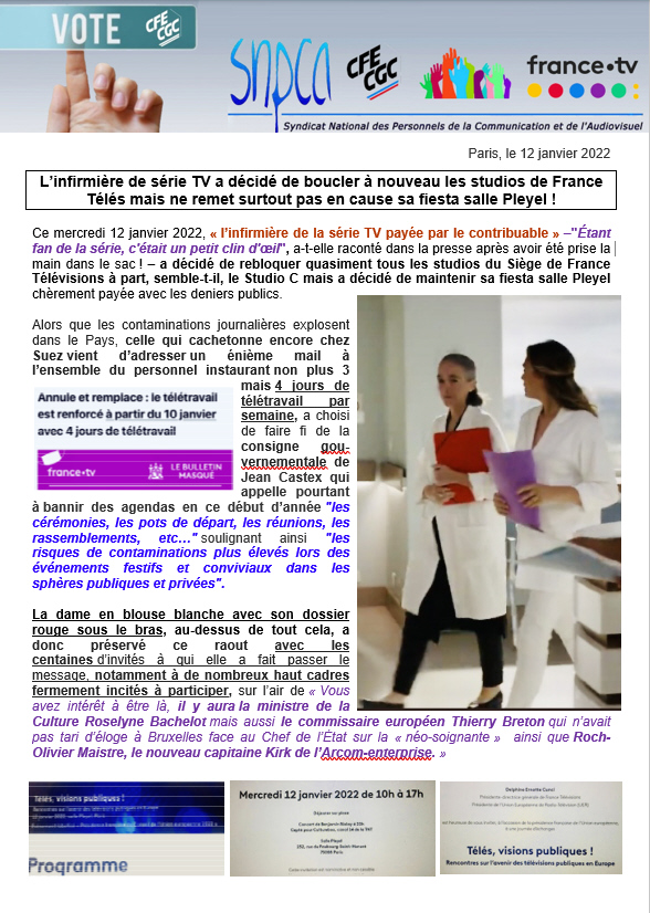 Ce mercredi 12 janvier 2022, "l’infirmière de la série TV payée par le contribuable" a décidé de rebloquer quasiment tous les studios du Siège de France Télévisions à part, semble-t-il, le Studio C mais a choisi de maintenir sa fiesta salle Pleyel chèrement payée avec les deniers publics.